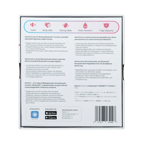 The clamps connect to the main remote by soft, flexible, nylon strings, where you can control the vibrations easily at the press of a button.  But for more fun, and way more options, connect the Gemini to your phone via Bluetooth® and use the Lovense control app to find endless possibilities for pleasure.  Control the vibrations yourself with the app or let your lover take control from across the room or across the country! Stay connected and intimate.