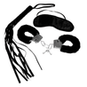- Kit Includes: 1 pair black furry metal handcuffs, 1 black satin blindfold, 1 black whip