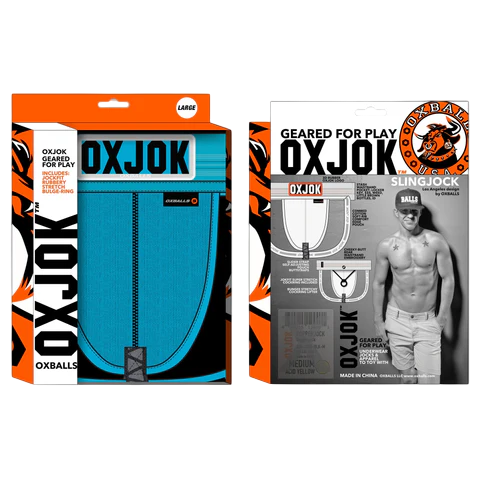 Bold 3-D rubber OXJOK on center-front plus OXBALLS pouchtag and rearview top-of-the-buttcrack OX logo are all designed to show you off front or back, includes our rubbery JOKFIT cockring and discrete BUNGEE cockring lifter inside the pouch pulls up your junk when you want more bulge