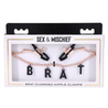 Embrace your brattiest attributes and proudly display your naughtiness with the Brat Charmed Nipple Clamps! Adjust the tension and explore pleasure at every intensity with the rubber tipped, rose gold chained nipple clamps. Own every teasing quality you love with the black charms stretched across the chain labelling you for what you love to be, a "BRAT"!